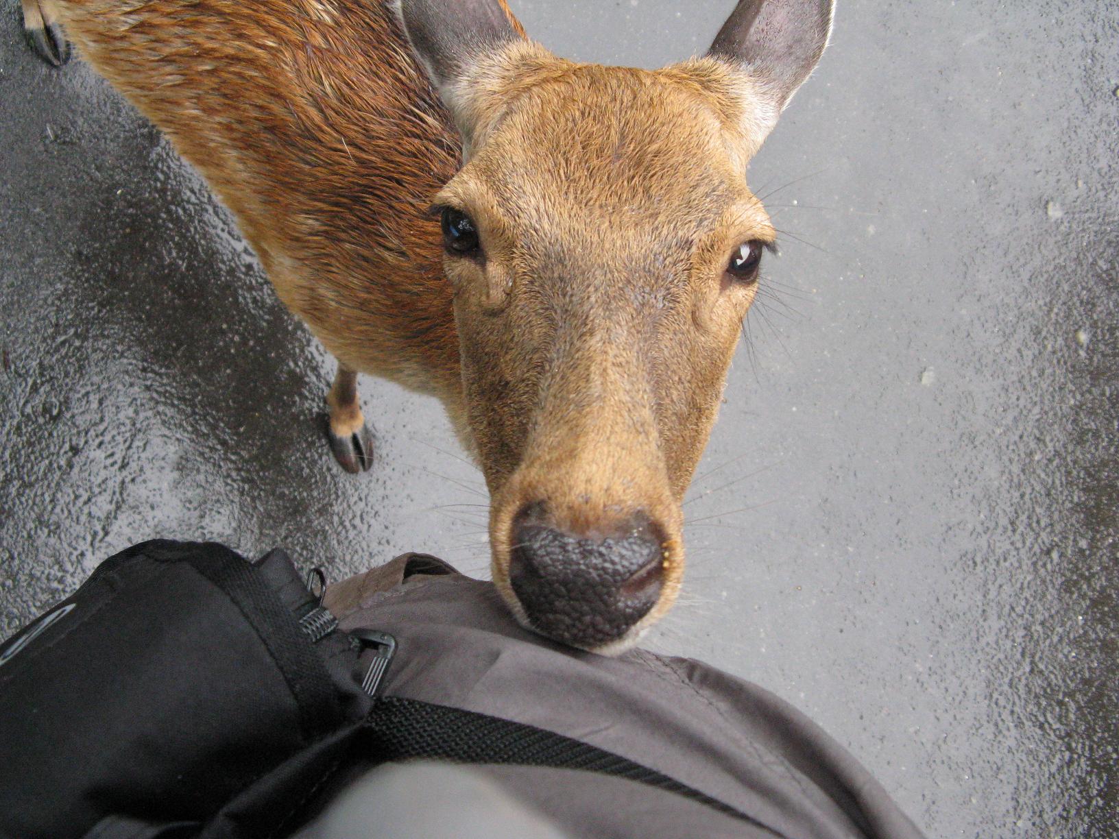 Malgré une pluie battante, nous sommes partis visiter la ville de Nara. Ce fût la première capitale japonaise en 710. Elle possède beaucoup de temples et de sanctuaires, dont huit sites classés 'patrimoine historique' de l'Unesco. La particularité de ce lieu est que la plupart des monuments sont situés au coeur d'un parc, qui est aussi le lieu d'habitation de plus de 1200 daims en liberté, qui sont aussi des trésors nationaux. Les daims n'ont pas du tout peur des humains et les visiteurs peuvent même les nourrir. D'ailleurs, certains daims n'hésitent pas à venir nous fouiller à la recherche de quelques biscuits :)