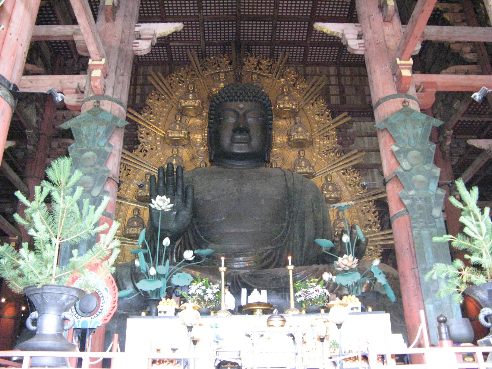 A l'intérieur du Todaiji, il y a un grand Bouddha, qui mesure 16 mètres de haut et pèse 437 tonnes de bronze et 130 kg d'or.