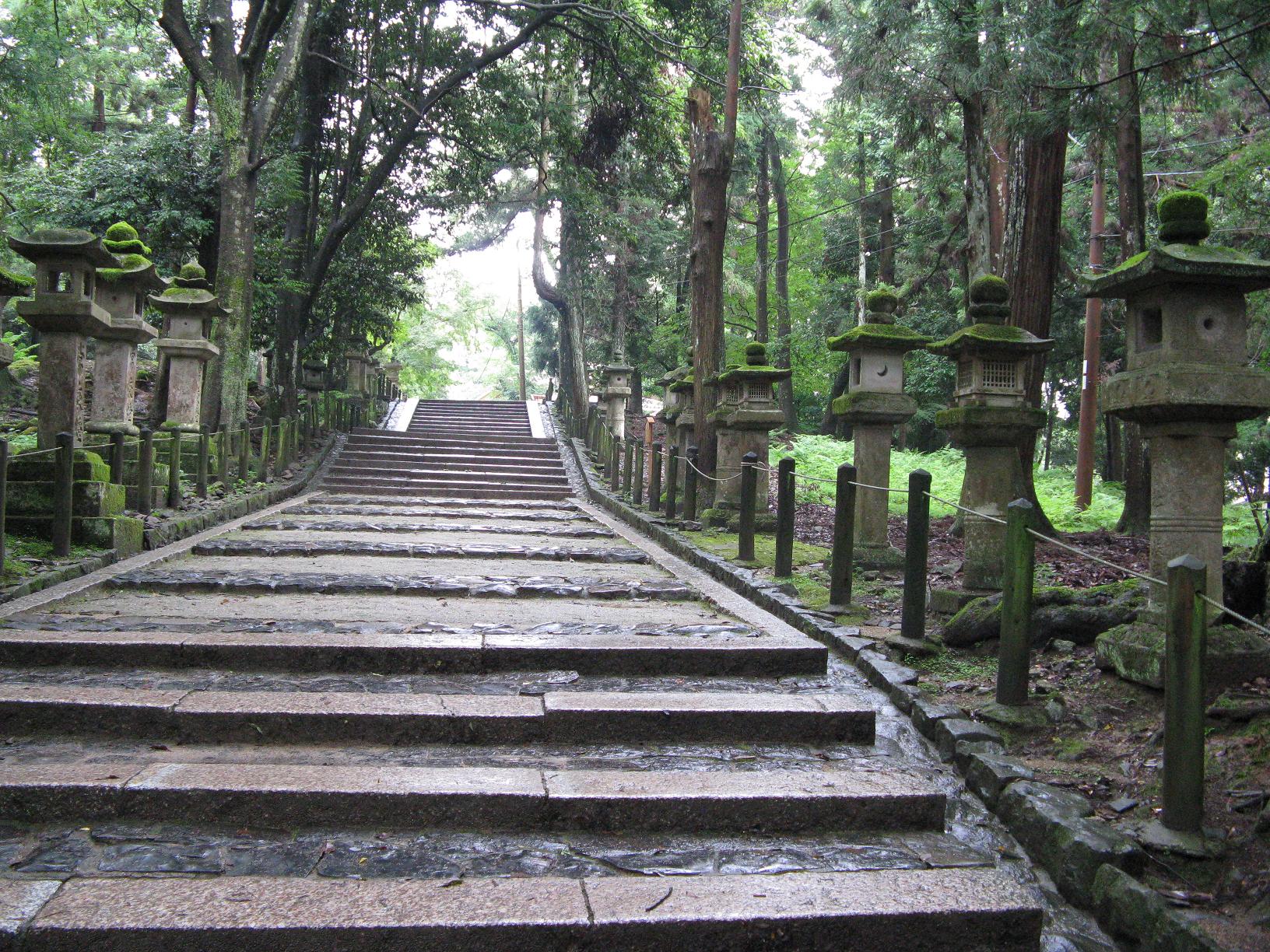 Le temple qui possèdait ces arbres était le temple Kasuga Taisha, le temple aux lanternes qui fête deux fois par an un festival dédié à ces lanternes. Au premier plan, on peut apercevoir un jardin de style japonais avec des rochers et du sable.