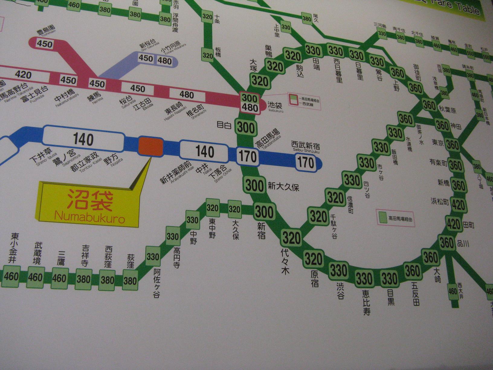 Pour nous situer par rapport au centre-ville de Tôkyô, voici un plan du métro. La boucle verte correspond au centre de Tôkyô, nous sommes donc à deux stations de métro de Shinjuku (qui est une des gares principales de Tôkyô). Sébastien a de la chance car sur ce plan-là le nom des stations est aussi écrit en alphabet romain donc il peut le lire. Ce n'est pas le cas partout.