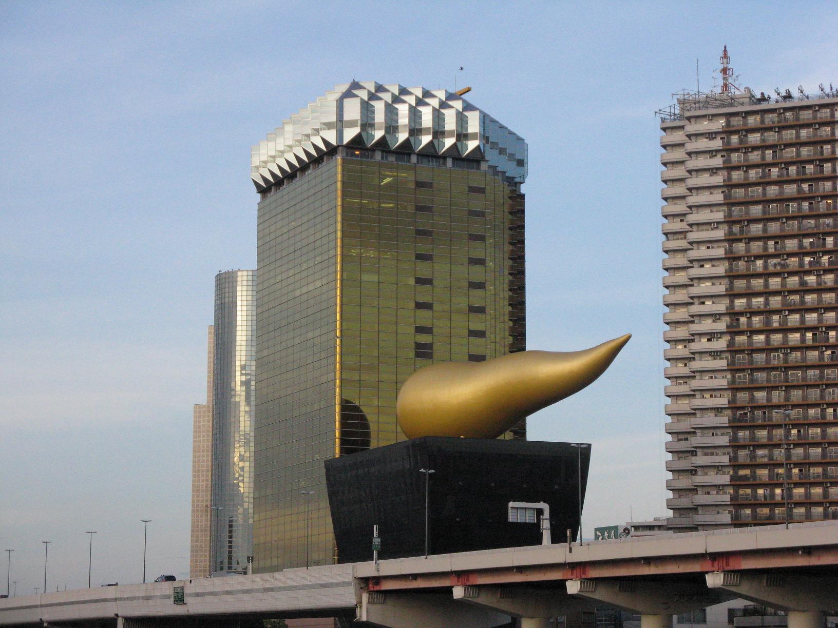 De l'autre côté de la rivière Sumida, on peut apercevoir un bâtiment à l'architecture particulière. Il s'agit du Asahi Building (siège social d'Asahi, la bière japonaise). Il a été dessiné par l'architecte Philip Starck (Time's Up powa !).