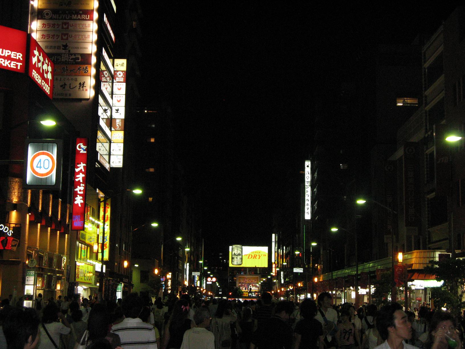 Le lieu de notre rendez-vous est Asakusa ; c'est l'endroit de Tôkyô où se situe le temple Sensô-ji dont on voit ici la porte principale Kaminarimon. Le temple était en travaux donc pas de photo disponible de celui-ci.